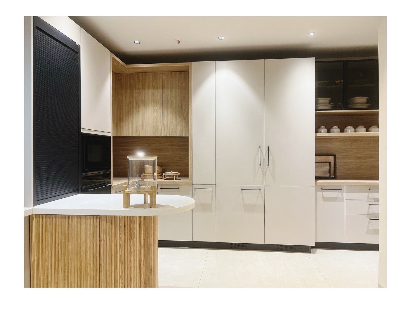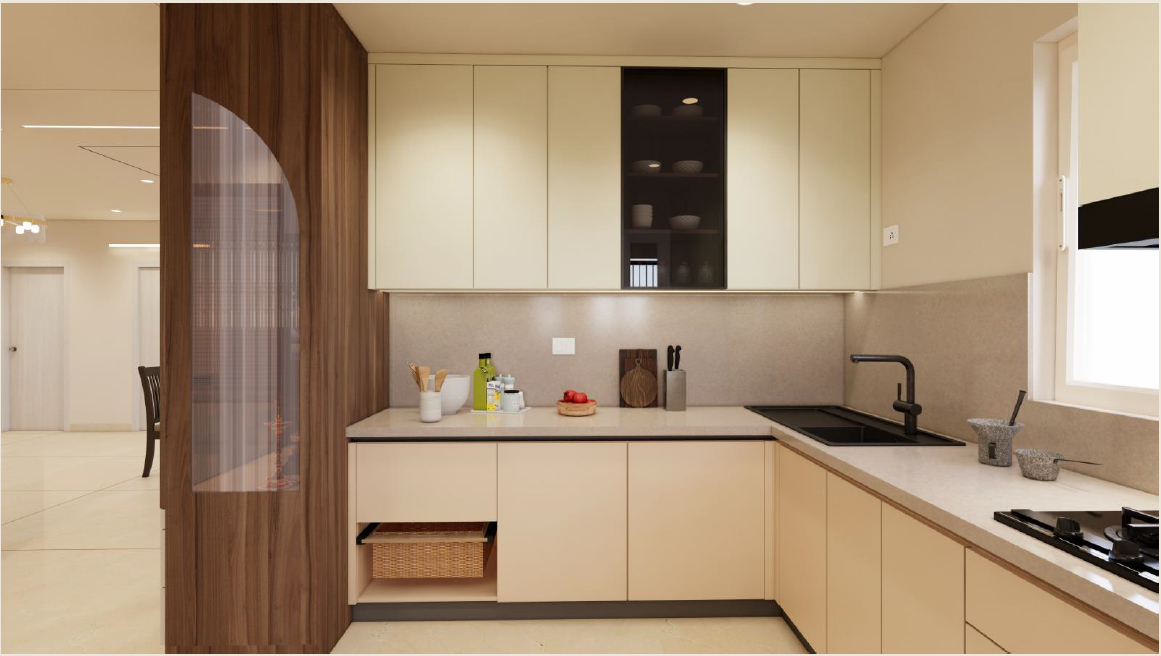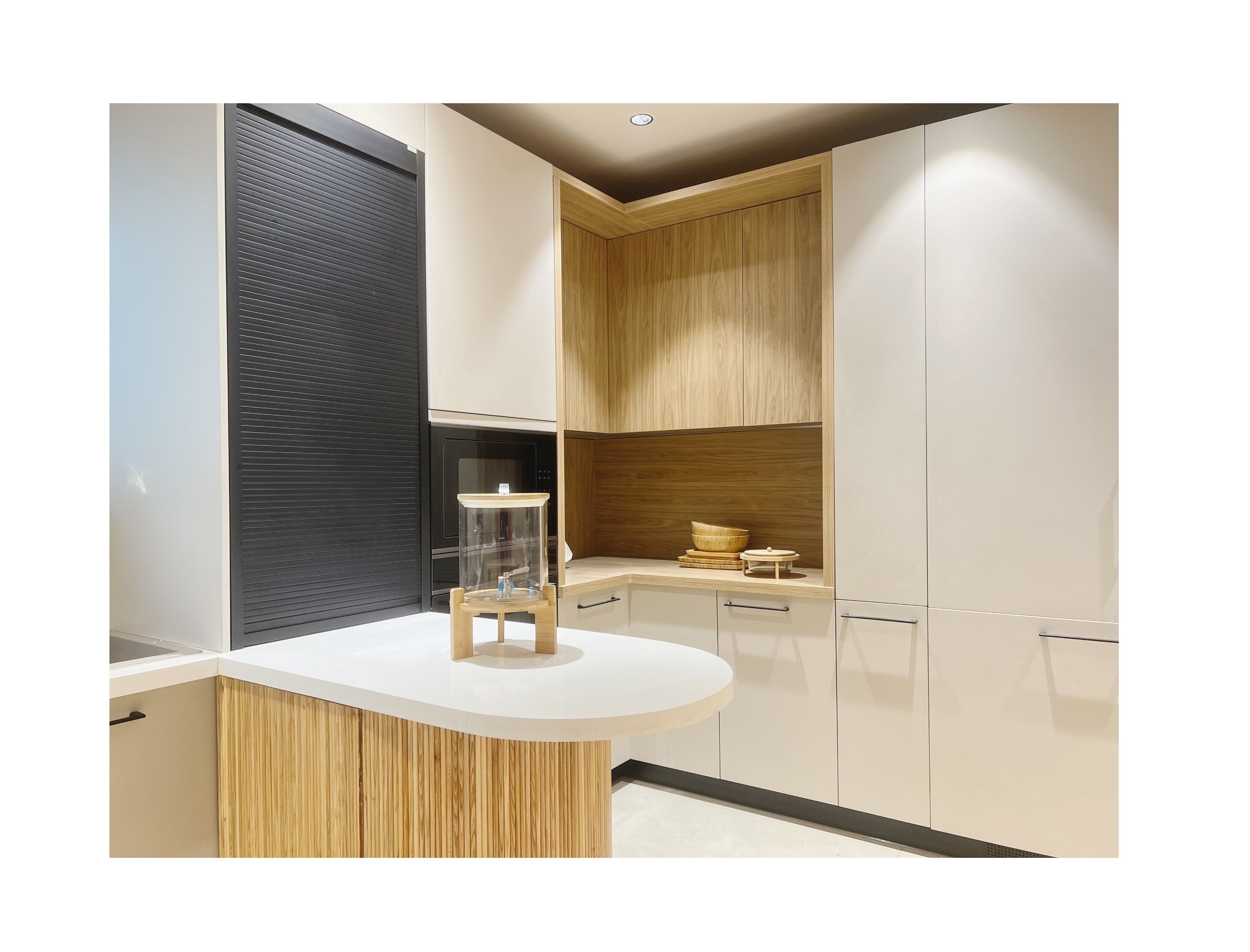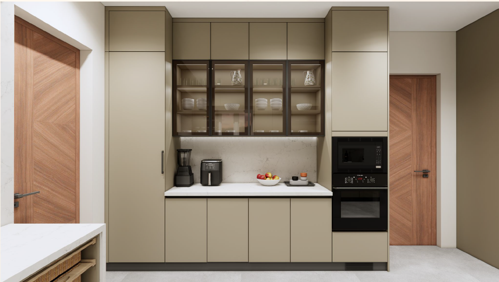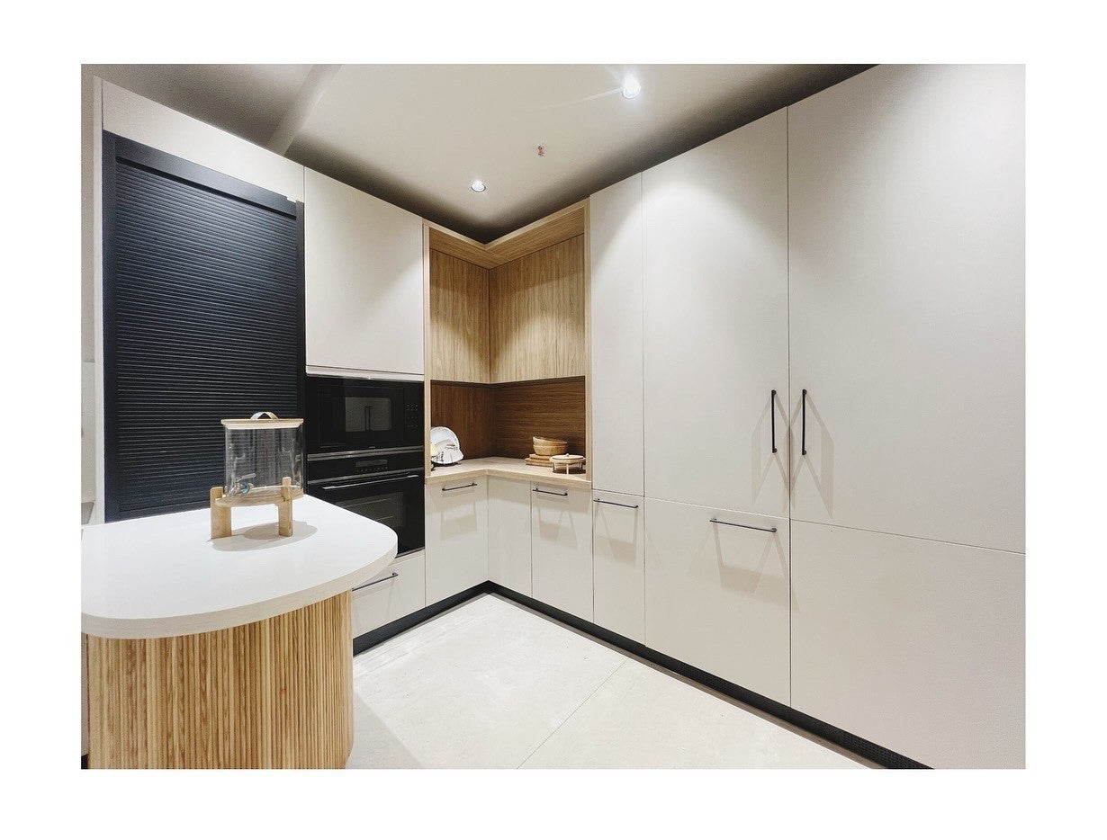 Taranam pairs soft matte PU fronts with warm wood interiors to create a calm, modern kitchen. A rounded stone island with fluted detailing softens the layout, while a concealed appliance garage keeps surfaces clear. Tall pantry units and integrated ovens support a smooth workflow, with precise alignment and subtle detailing bringing the space together.