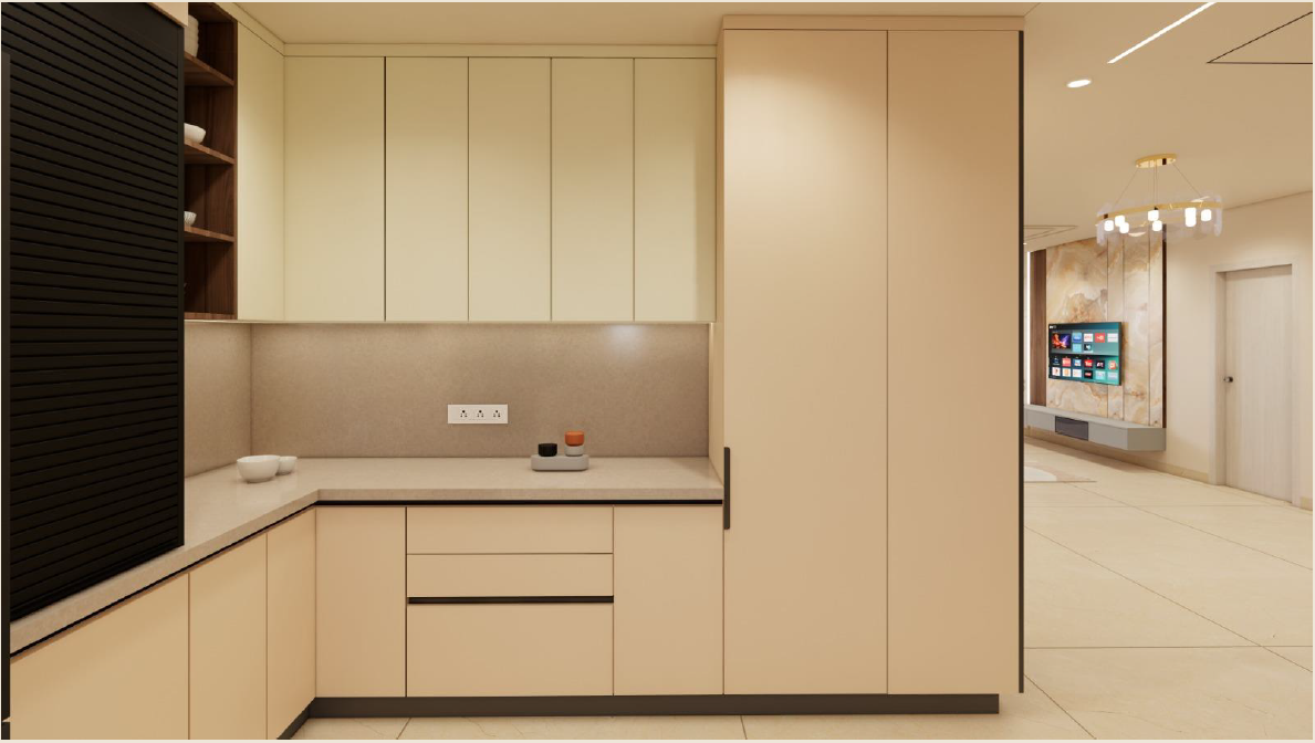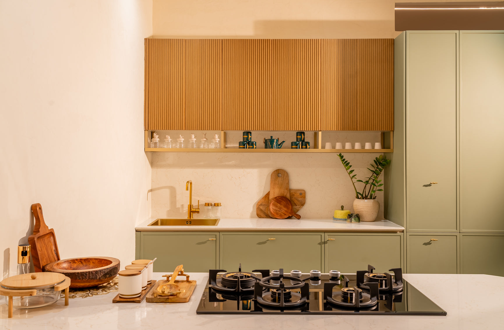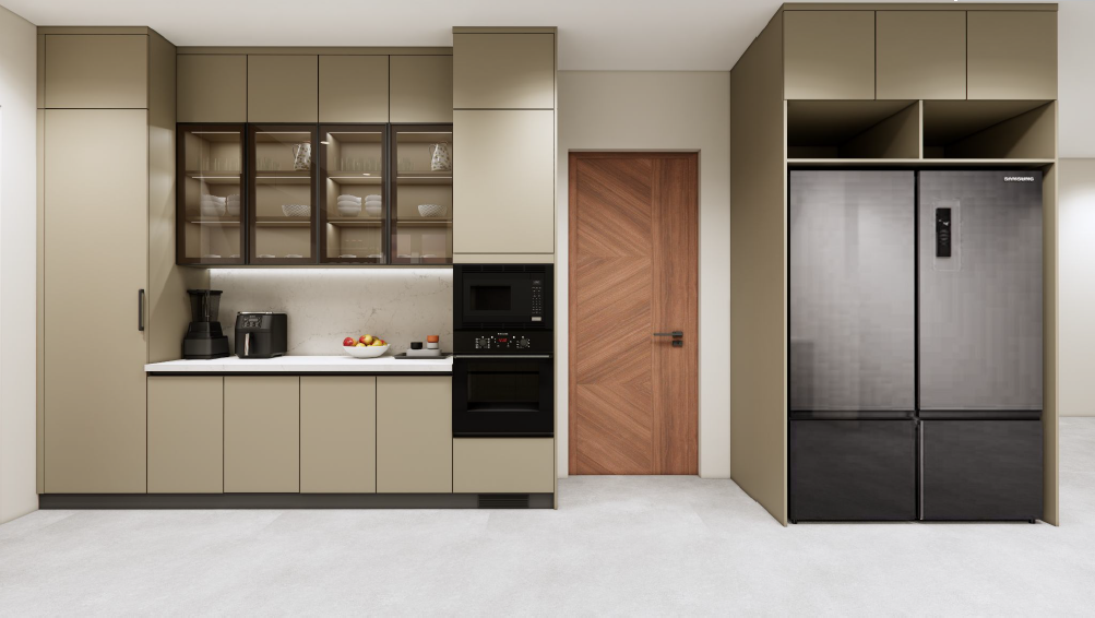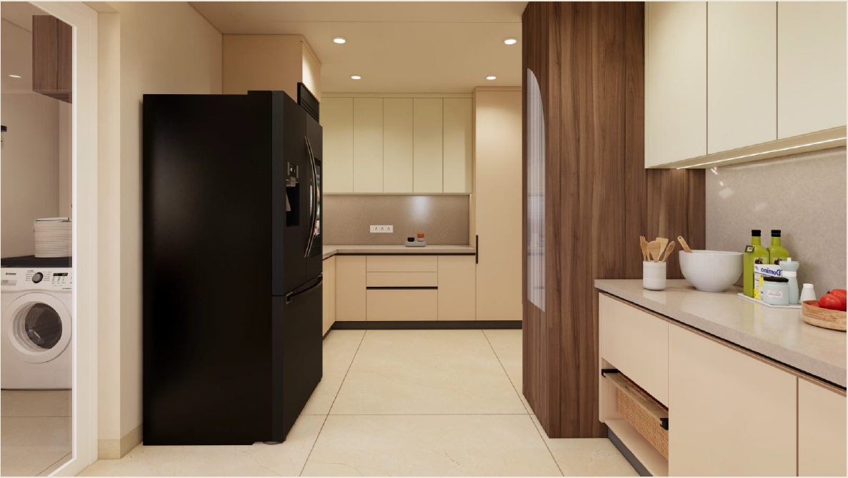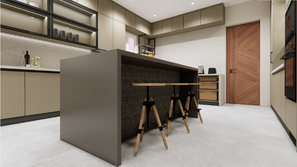 Taranam pairs soft matte PU fronts with warm wood interiors to create a calm, modern kitchen. A rounded stone island with fluted detailing softens the layout, while a concealed appliance garage keeps surfaces clear. Tall pantry units and integrated ovens support a smooth workflow, with precise alignment and subtle detailing bringing the space together.