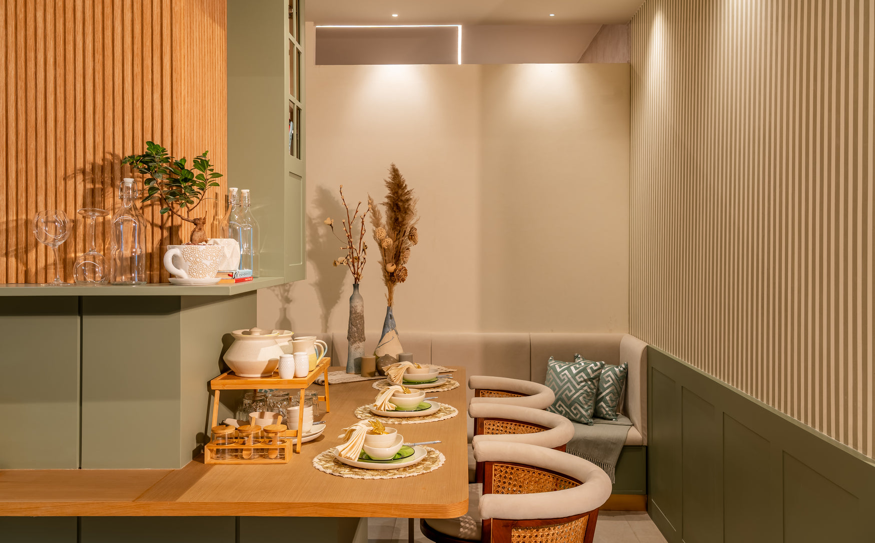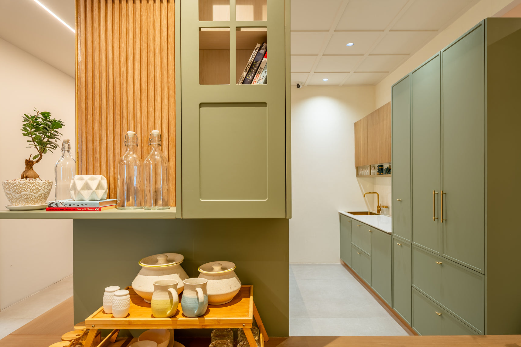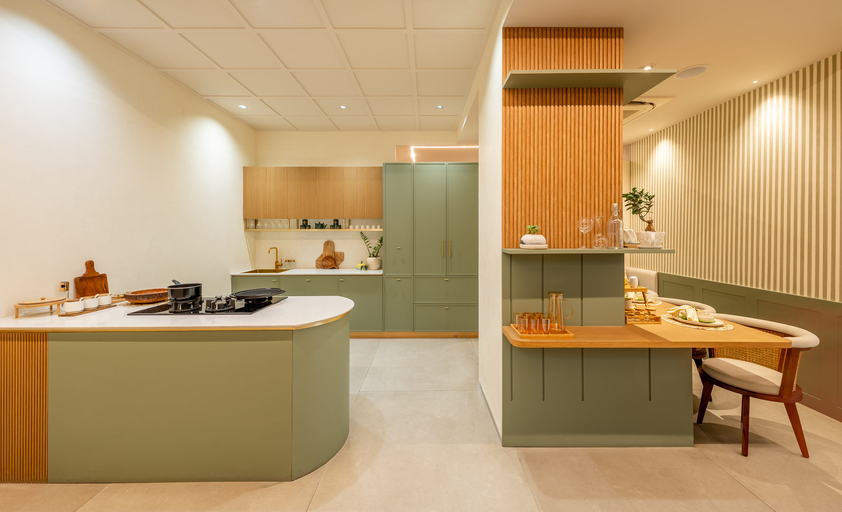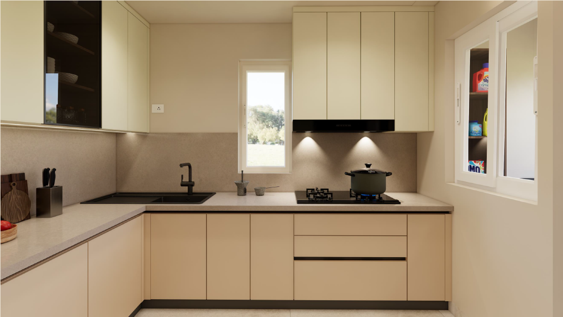 Taranam pairs soft matte PU fronts with warm wood interiors to create a calm, modern kitchen. A rounded stone island with fluted detailing softens the layout, while a concealed appliance garage keeps surfaces clear. Tall pantry units and integrated ovens support a smooth workflow, with precise alignment and subtle detailing bringing the space together.