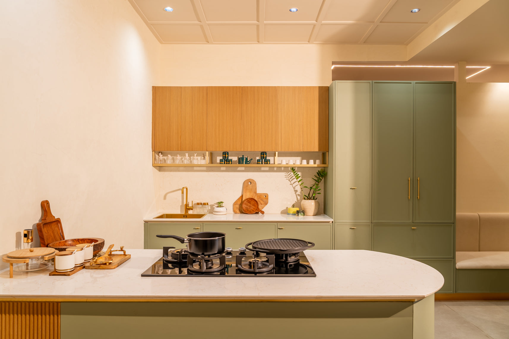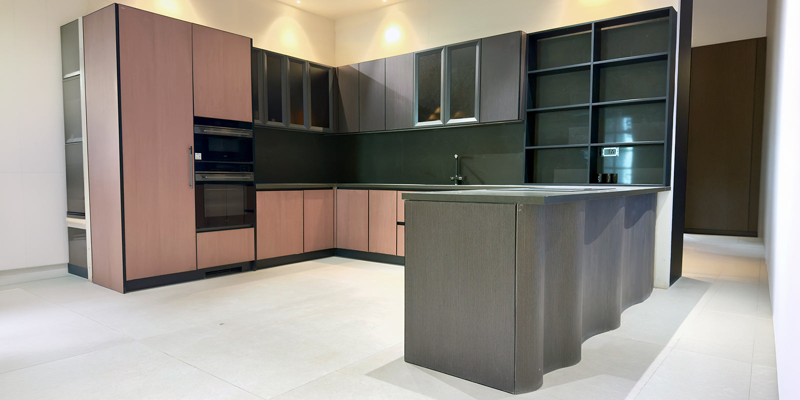 Wood meets matte, glass meets stone, each combination is intentional. The result is a kitchen that feels layered, distinctive, and visually engaging while remaining functional and composed.